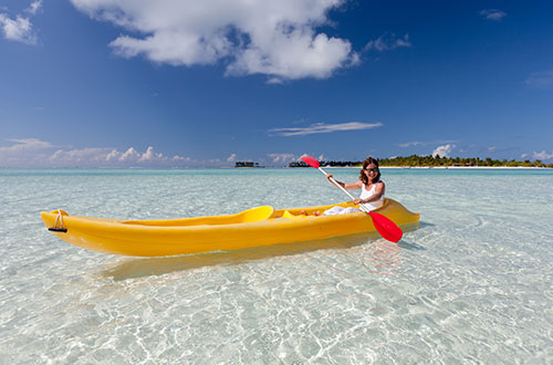 Τα ήρεμα νερά του Ινδικού Ωκεανού και το μαγευτικό τοπίο του νησιού που παρατάσσεται από φοίνικες συνθέτουν μια χαλαρωτική εμπειρία καγιάκ στις Μαλδίβες.